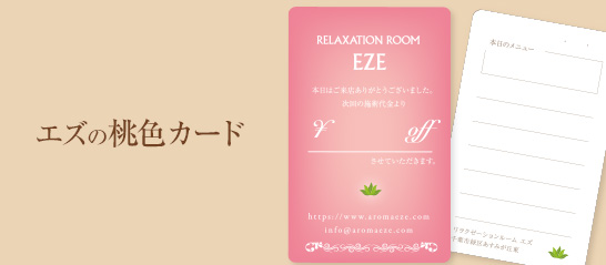 このカードのおもて面では、エズのメールアドレスの記載とともに次回ご来店の際のお値引き金額をお知らせし、裏面ではお受けいただいたメニュー・メッセージを記入しております。